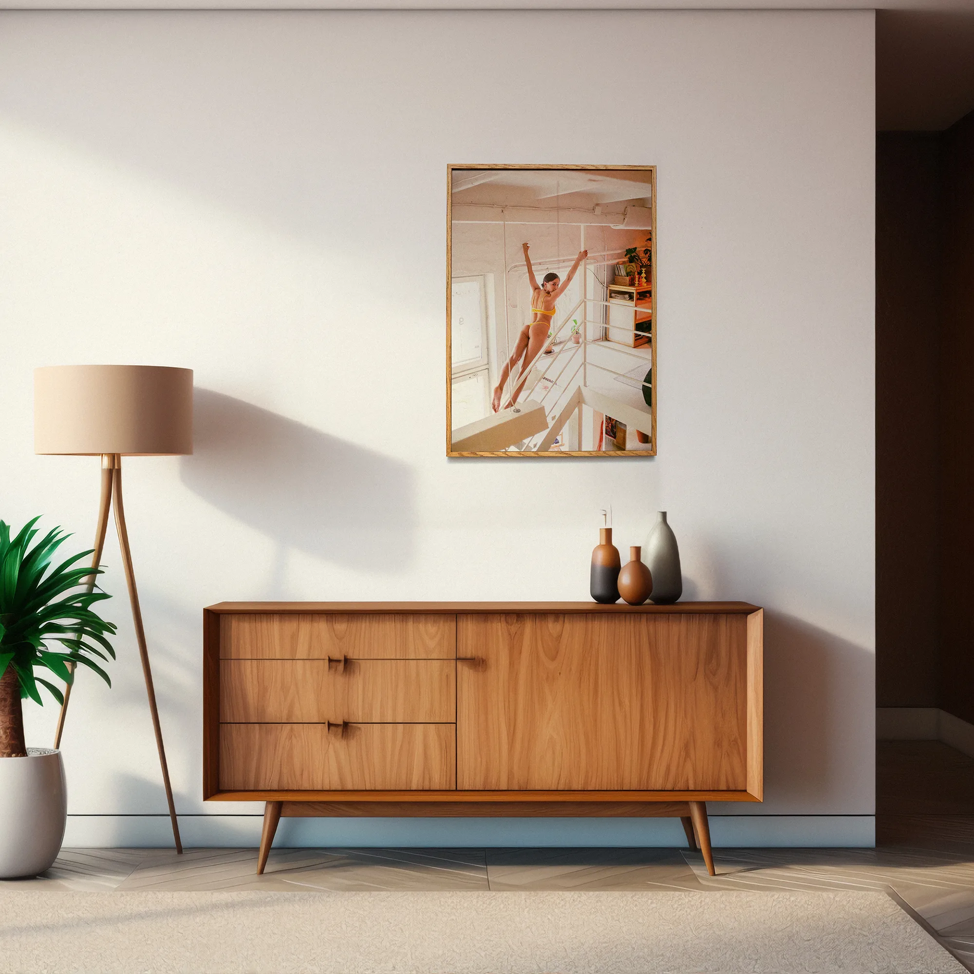 - Print jest oprawiony w dębową ramę z detalem łączenia.